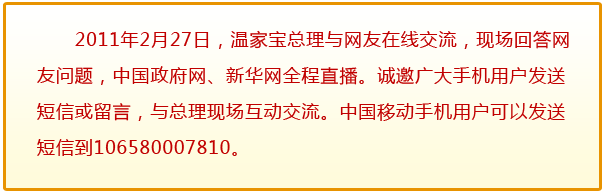 · [手機尾號9659]:溫總理您好!國家開展十一五計劃,我也給自己定了一個十一三計劃,希望結合國家的輔助,加上我們自己的努力,能在不久的將來,建設一個全新的小康社會,也希望我的家鄉,河南濮陽會越來越好!您保重身體。