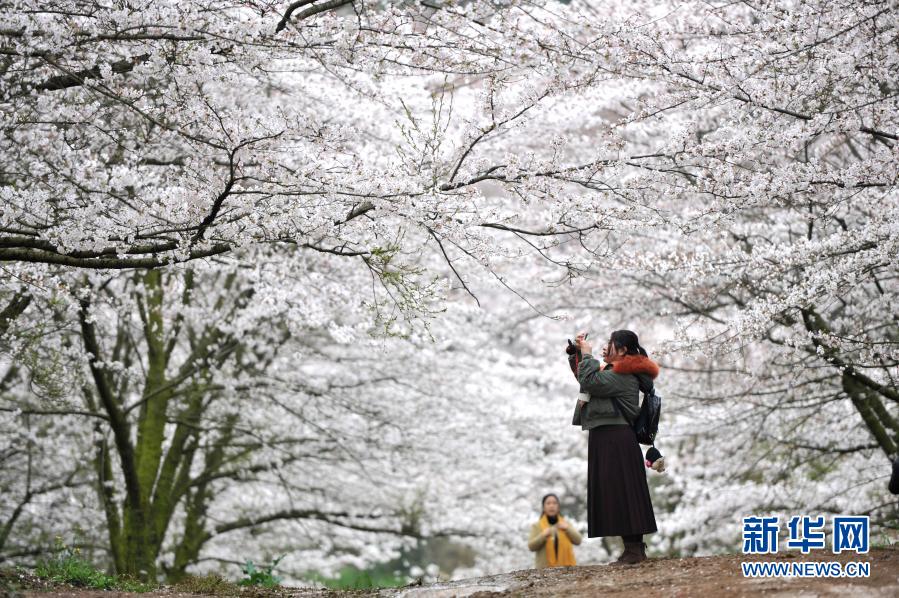 春季里,貴州省貴安新區紅楓湖畔的櫻花園內櫻花綻放,花海如云似雪,吸引游人踏春賞櫻。