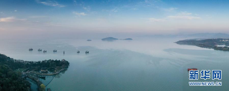 3月13日拍攝的江蘇省無錫市太湖黿頭渚景區晨景(無人機全景照片)。