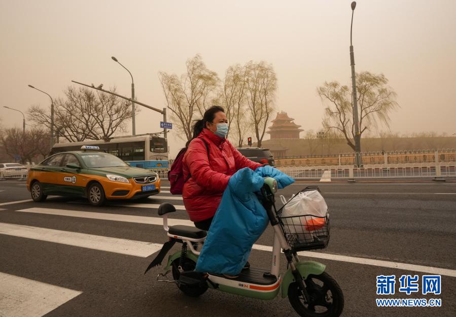 3月15日,市民騎車從北京故宮角樓附近經過。當日,我國北方多地出現沙塵天氣。新華社記者 陳曄華 攝