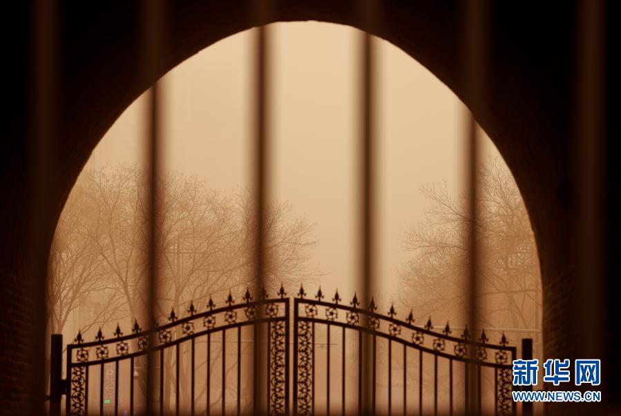 這是3月15日拍攝的沙塵中的寧夏銀川鼓樓拱門。當日,我國北方多地出現(xiàn)沙塵天氣。新華社記者 楊植森 攝