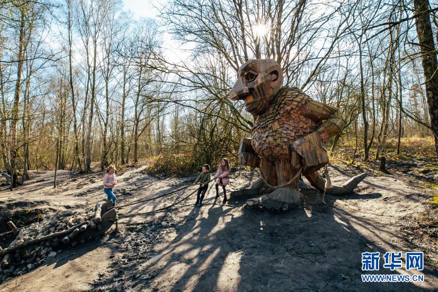 3月20日,孩子們在比利時博姆市的德舒爾森林公園和一座“巨人”雕塑“玩耍”。新華社記者 張鋮 攝