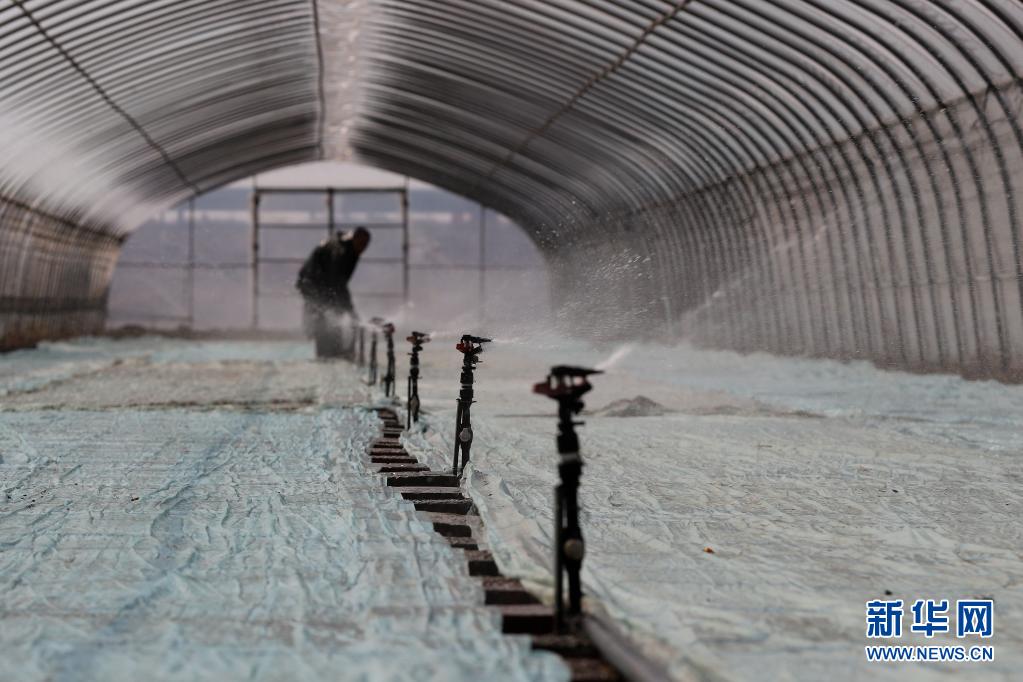4月6日,河北省唐山市海港經濟開發(fā)區(qū)水稻種植合作社的社員在育秧棚內給秧盤澆水。