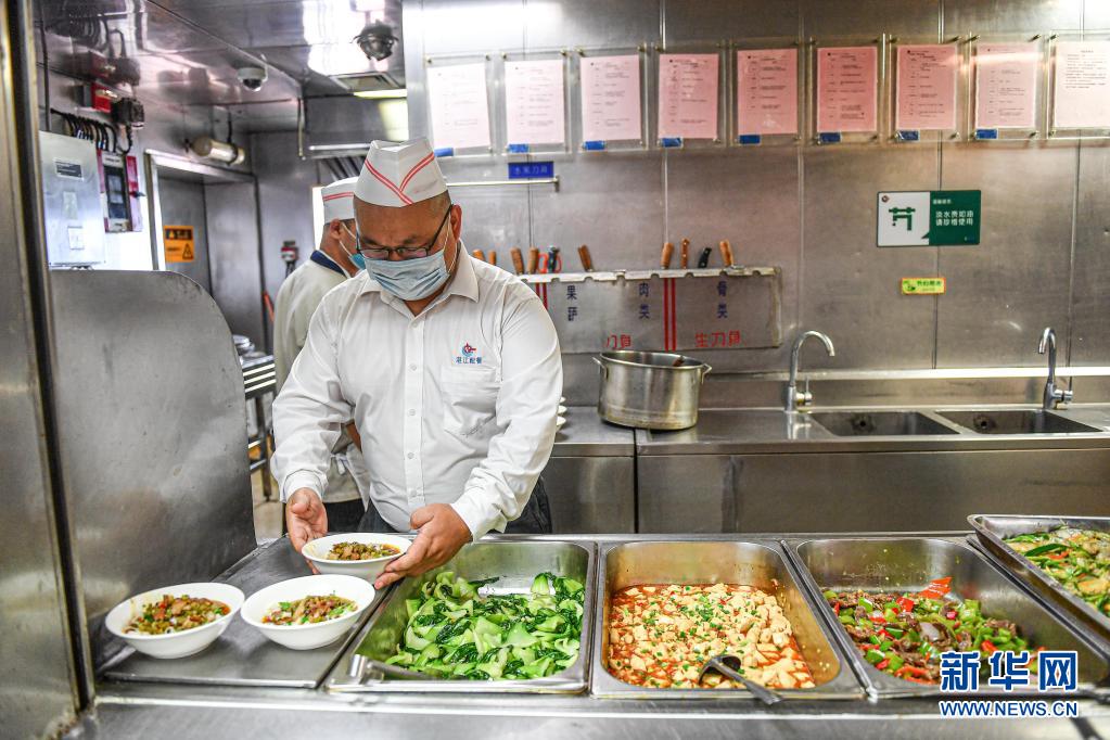 4月25日,廚師在中國海油樂東15-1氣田餐廳內準備午餐。