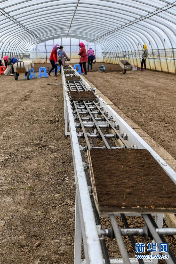 在吉林省吉林市永吉縣九月豐家庭農(nóng)場(chǎng),水稻育秧生產(chǎn)線將種好種子的秧盤送到農(nóng)民手中(4月13日攝)。新華社記者 張楠 攝