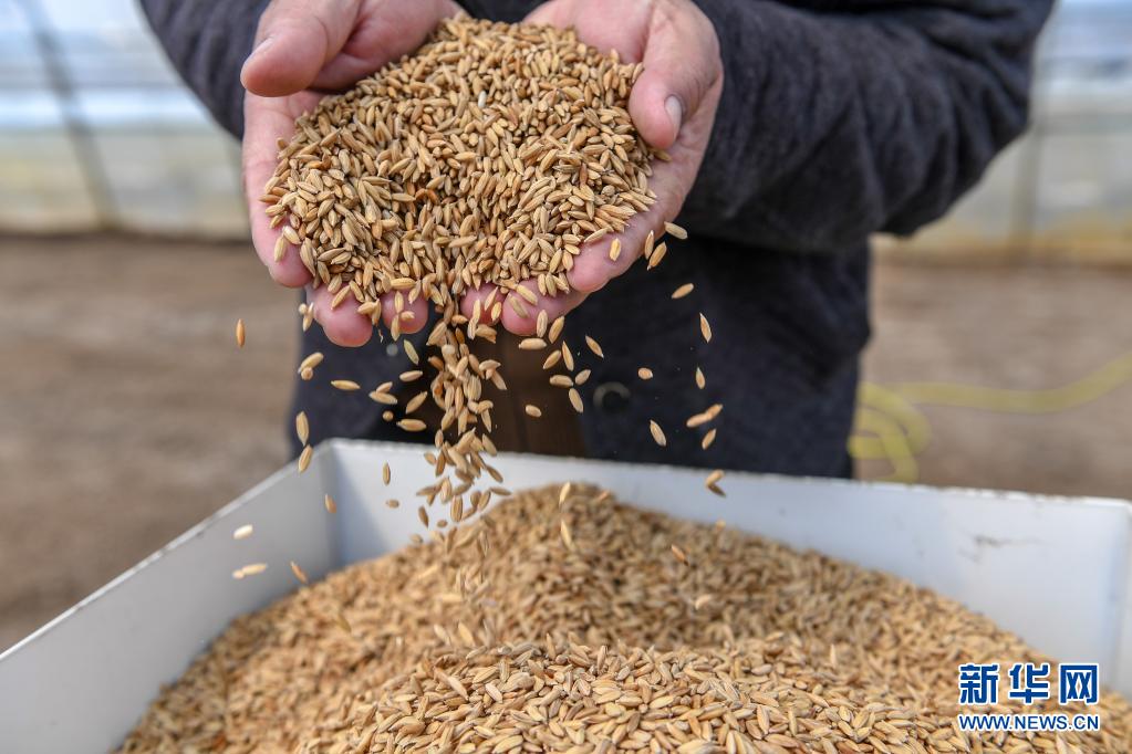 在吉林省吉林市永吉縣九月豐家庭農(nóng)場(chǎng),負(fù)責(zé)人肖建波將水稻種子倒入育秧機(jī)(4月13日攝)。新華社記者 張楠 攝