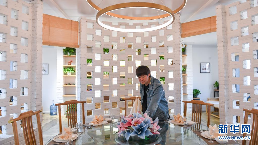 在吉林市船營(yíng)區(qū)大綏河鎮(zhèn),創(chuàng)業(yè)者曹曦在民宿餐廳內(nèi)擺放餐具(4月20日攝)。新華社記者 張楠 攝