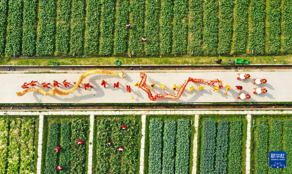 2月21日,在安徽省合肥市肥东县合肥循环经济示范园泰和社区,人们在表演舞龙。