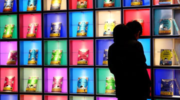 2月22日,在西藏博物馆,游客手持印有“吉祥八宝”图案的木刻印刷品拍照留念。