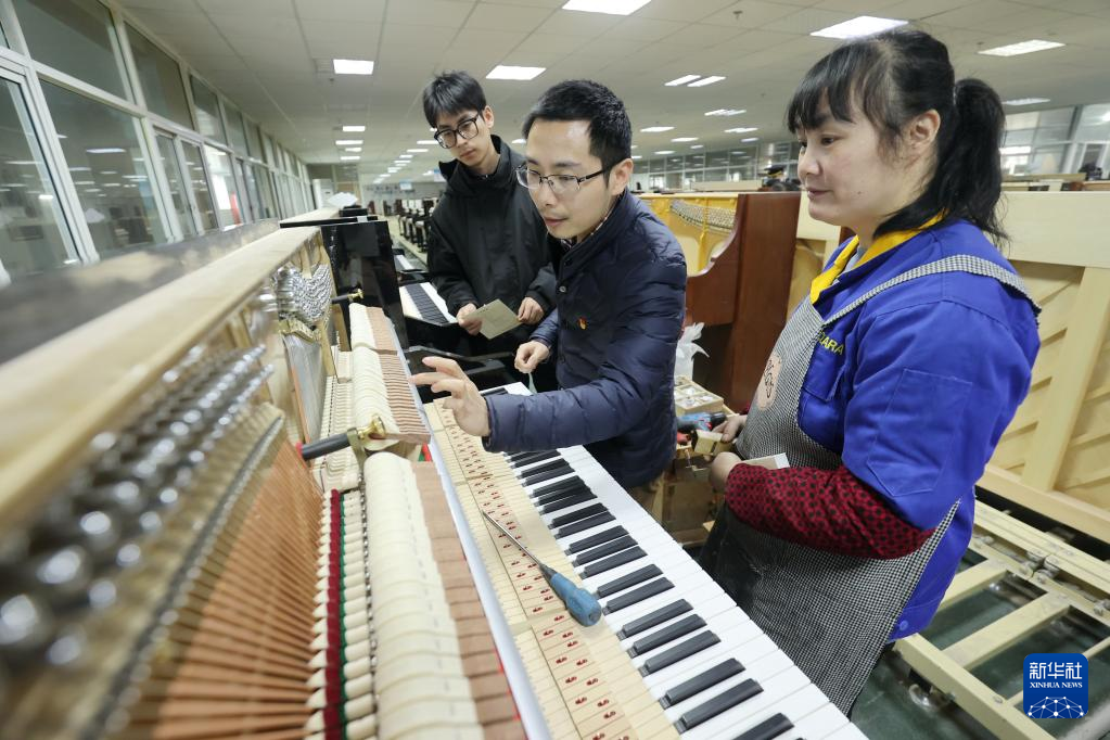 3月23日,工人在德清县洛舍镇东衡村一家钢琴制造企业内装配钢琴。