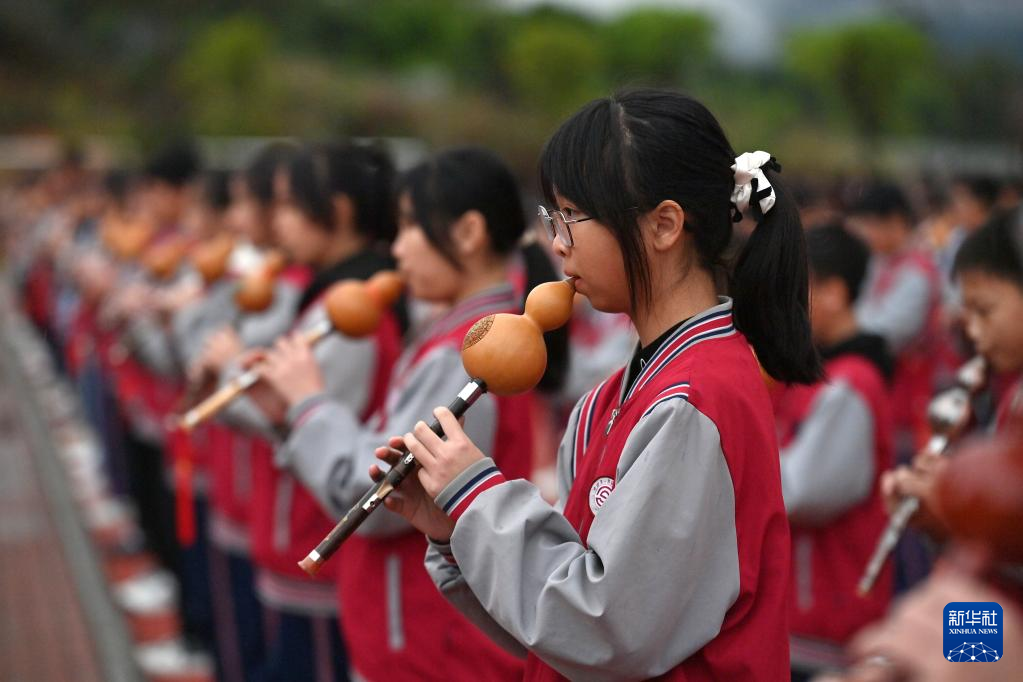 3月29日,在广西梧州市苍梧县第一初级中学,同学们在吹奏葫芦丝。