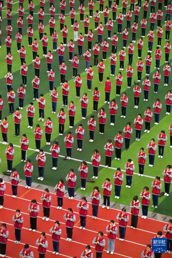 3月29日,在广西梧州市苍梧县第一初级中学,同学们在阳光大课间吹奏葫芦丝。