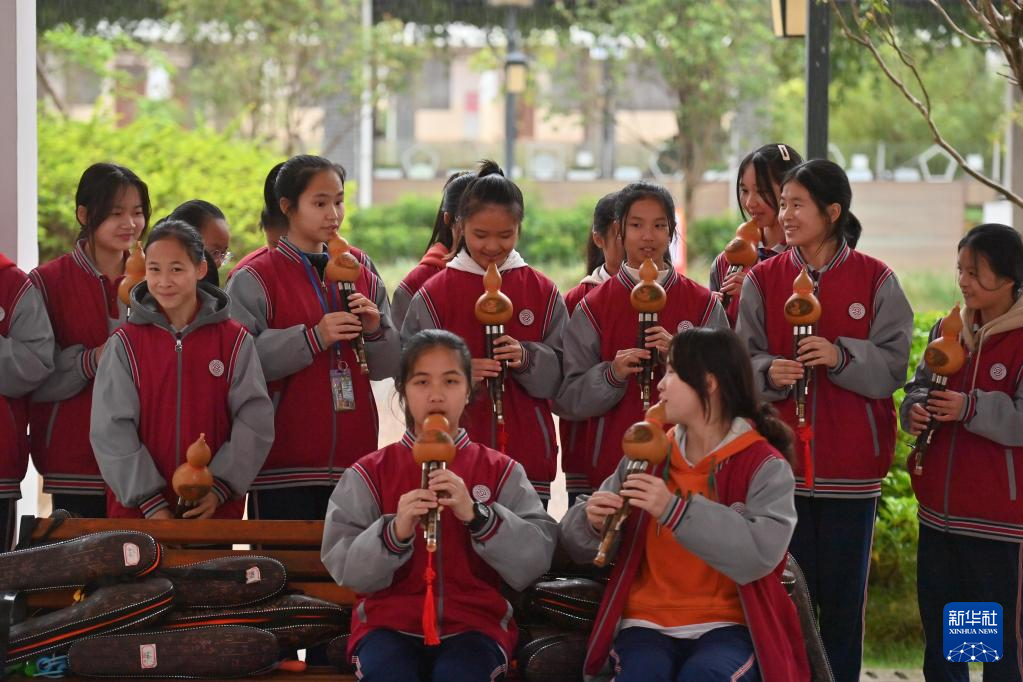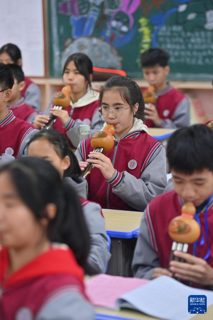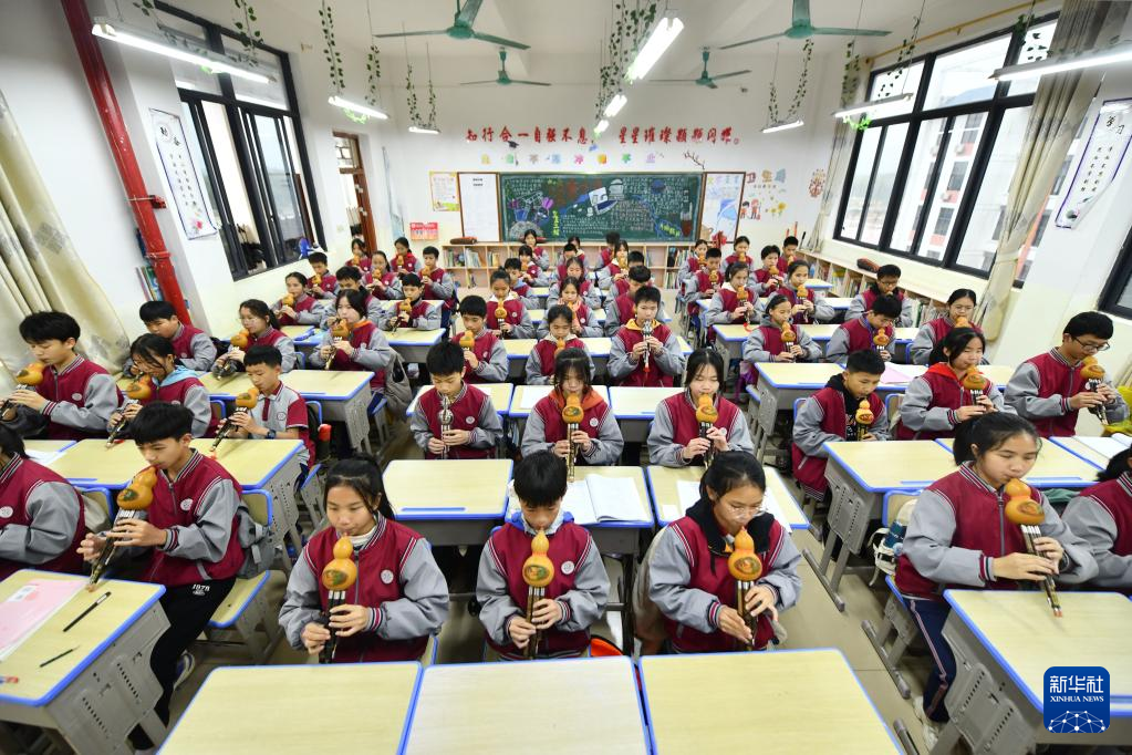 3月29日,在广西梧州市苍梧县第一初级中学,同学们在课间吹奏葫芦丝。