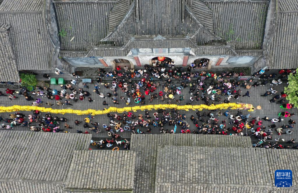 这是4月5日在成都崇州市元通古镇拍摄的“汇江老龙”巡游队伍(无人机照片)。
