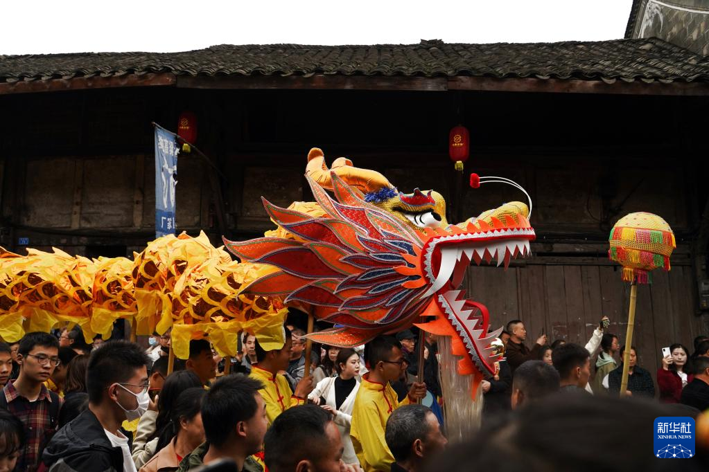 4月5日,游客在成都崇州市元通古镇观看“汇江老龙”巡游表演。