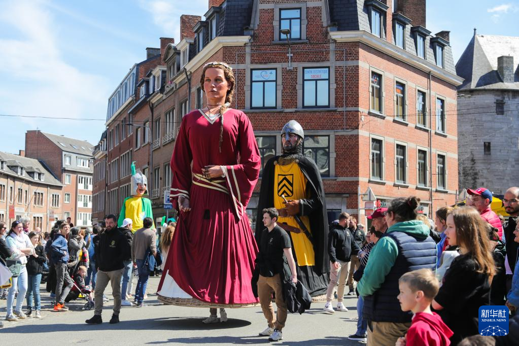 4月15日,装扮成“巨人”的演员在比利时那慕尔市传统民俗日活动上为观众表演。