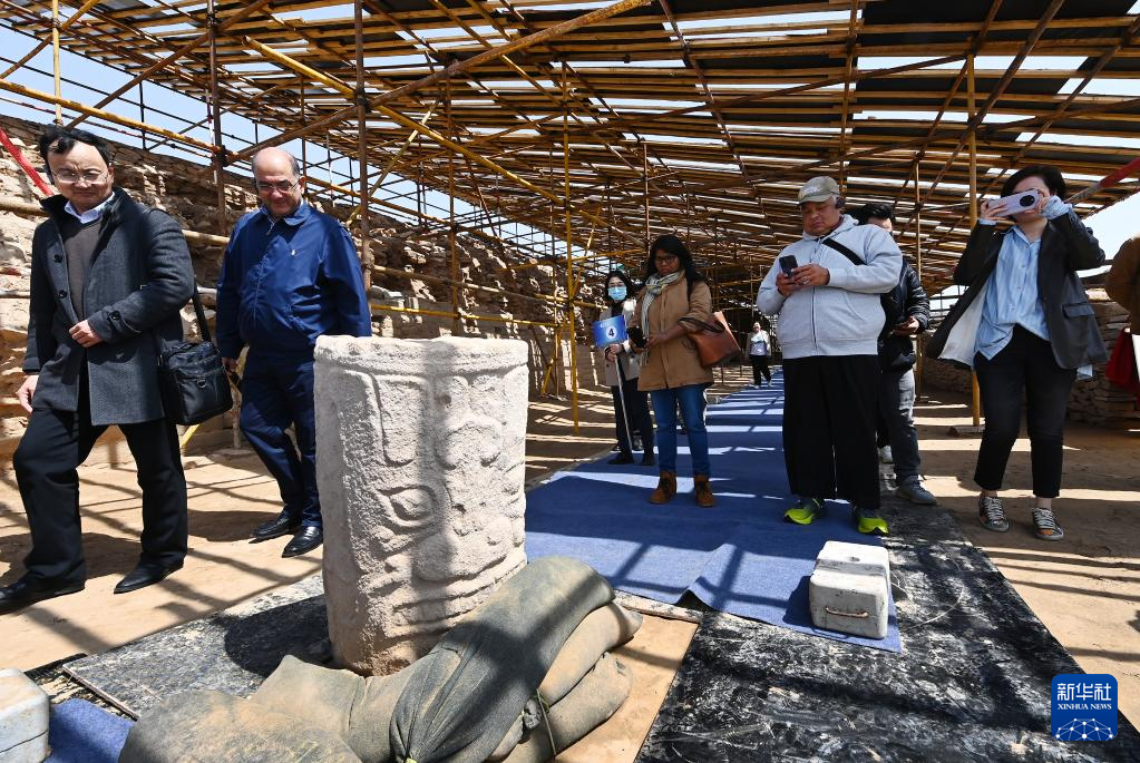 4月26日,外宾在陕西石峁遗址东城门遗址参观调研。