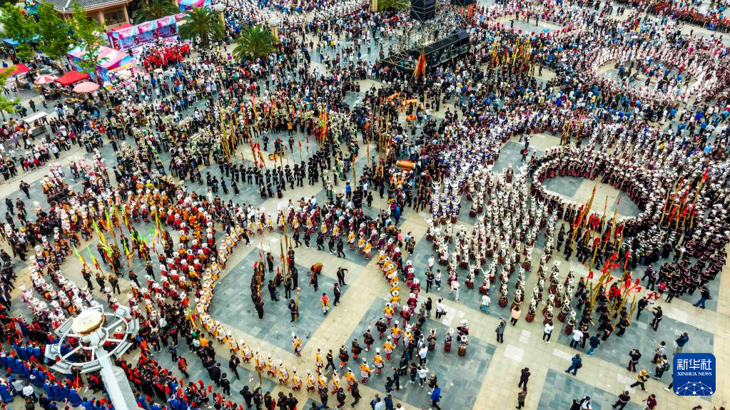 5月2日,人们在贵州省台江县姊妹广场参加苗族姊妹节盛装活动(无人机照片)。