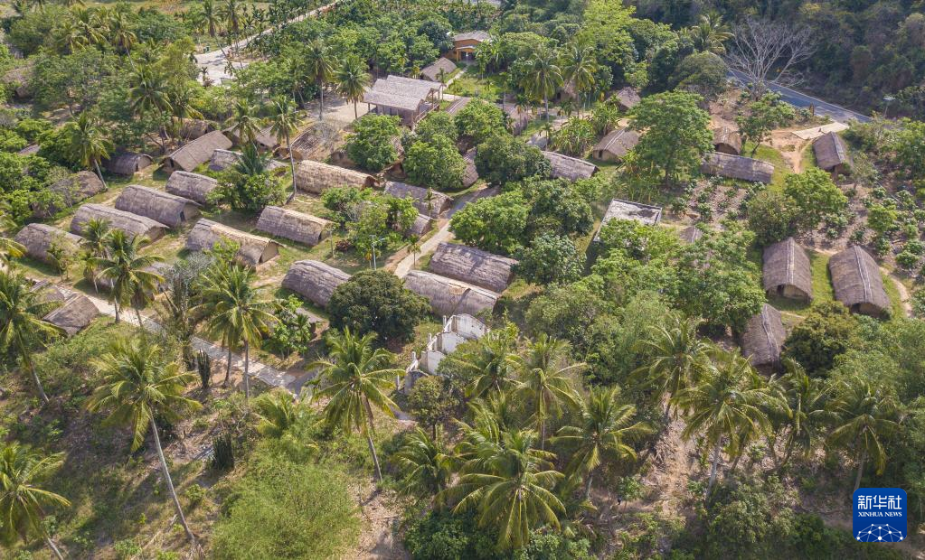 4月28日在海南省东方市白查村拍摄的黎族船型屋及近年修建的道路(无人机照片)。