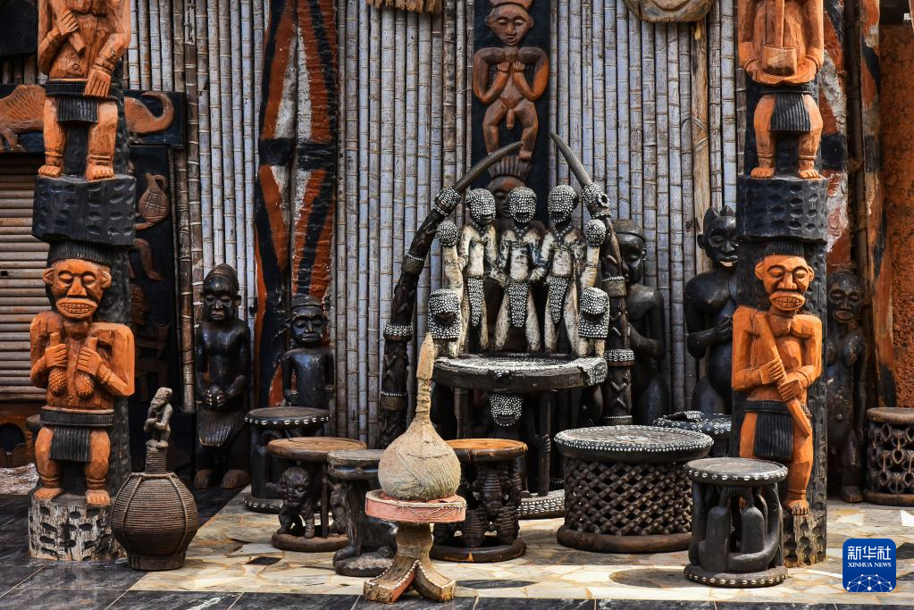 这是4月13日在喀麦隆西部大区拍摄的巴图方酋邦宫殿内的木制器物。