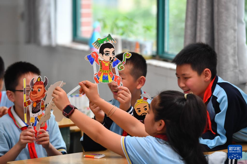 5月15日,在长沙市天心区红卫小学,学生在皮影戏课上相互展示自己制作的皮影戏道具。