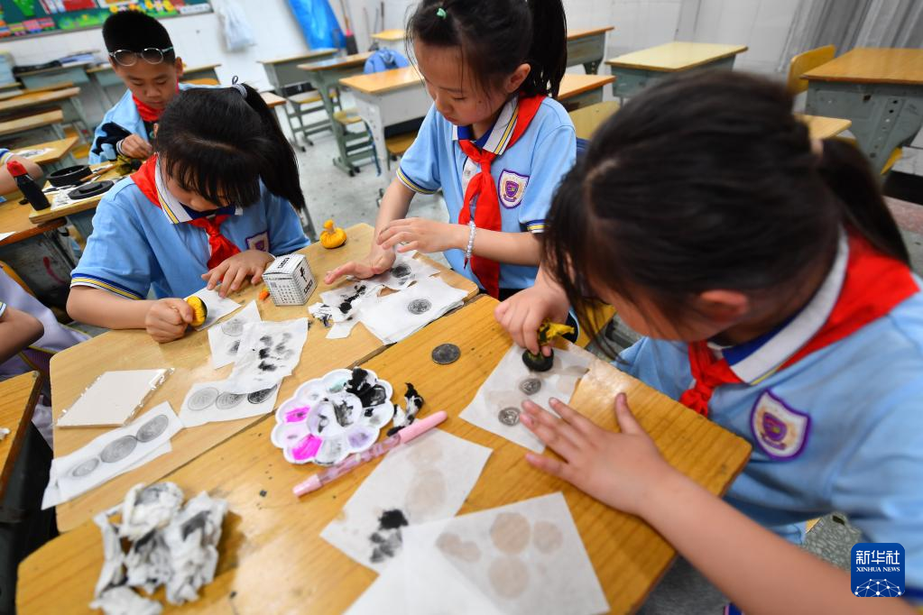 5月15日,在长沙市天心区红卫小学,学生在拓印课上体验拓印制作。
