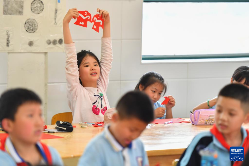 5月15日,在长沙市天心区红卫小学,学生在剪纸艺术课上展示作品。