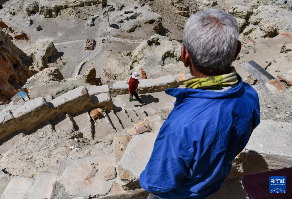 皮央石窟群所在的小山,就在西藏阿里地区札达县东嘎村仁增旺扎老人的家旁边。老人拄着拐棍,沿着陡峭的台阶,颤颤巍巍、一步一步,400多级台阶,用时近30分钟。