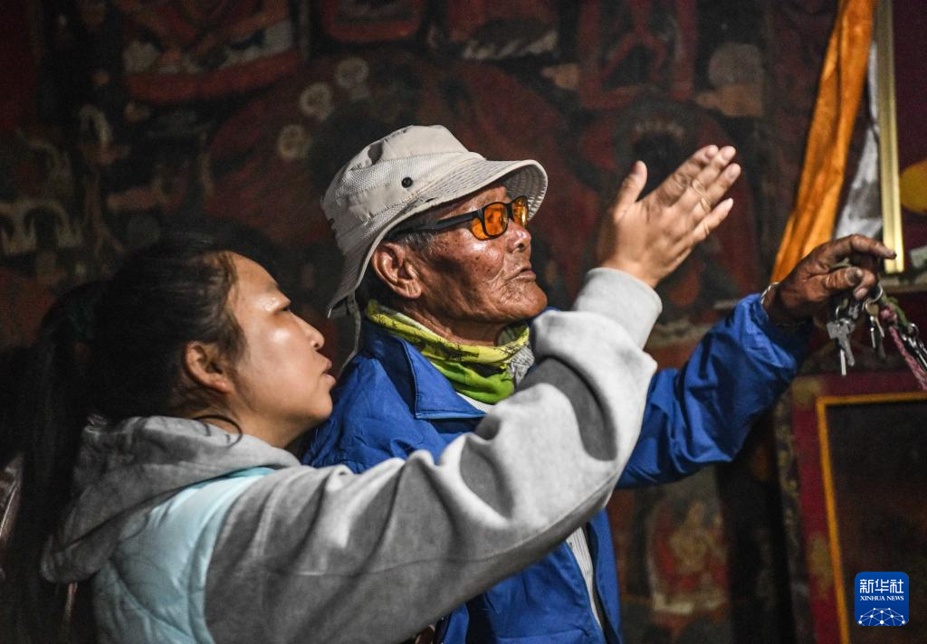 皮央和东嘎石窟遗址文保员仁增旺扎老人给游客讲解壁画(5月26日摄)。