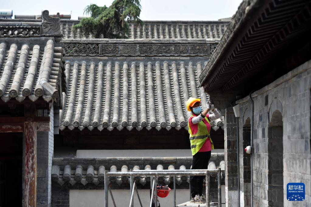6月7日,施工人员在河北省石家庄市井陉县小梁江村进行古建筑修缮。