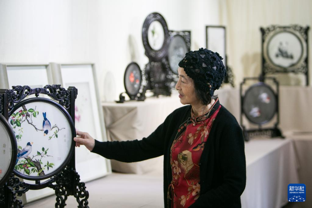 在重庆市渝中区的重庆渝康宁蜀绣艺术研究院,康宁在看工作室的蜀绣作品(5月12日摄)。