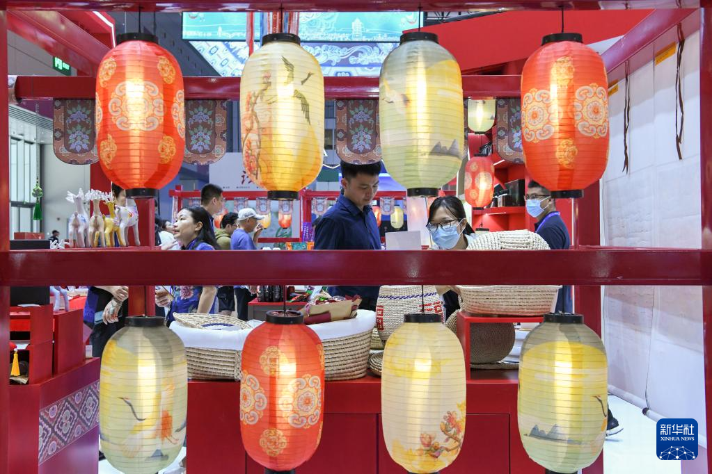 6月9日,在文博会“文旅消费馆·一带一路国际馆”陕西展台,观众浏览选购特色商品。