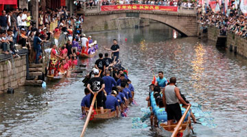 6月20日,当地居民和游客在胥溪边观看传统龙舟赛。