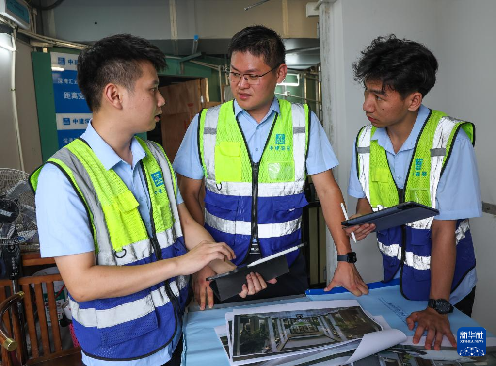伍涛(中)和同事在350米高处的深湾汇云中心空中平台研究这里的空间装饰设计(无人机照片,6月26日摄)。