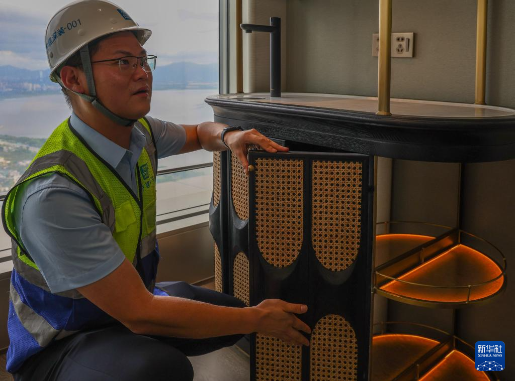站在350米高处的深湾汇云中心空中平台,近处是深圳湾超级总部的一派繁华,一路之隔的海岸则是大片生态红树林。这栋超高楼宇的66层至79层就是伍涛团队正在打造装饰的一家国际著名品牌酒店。
