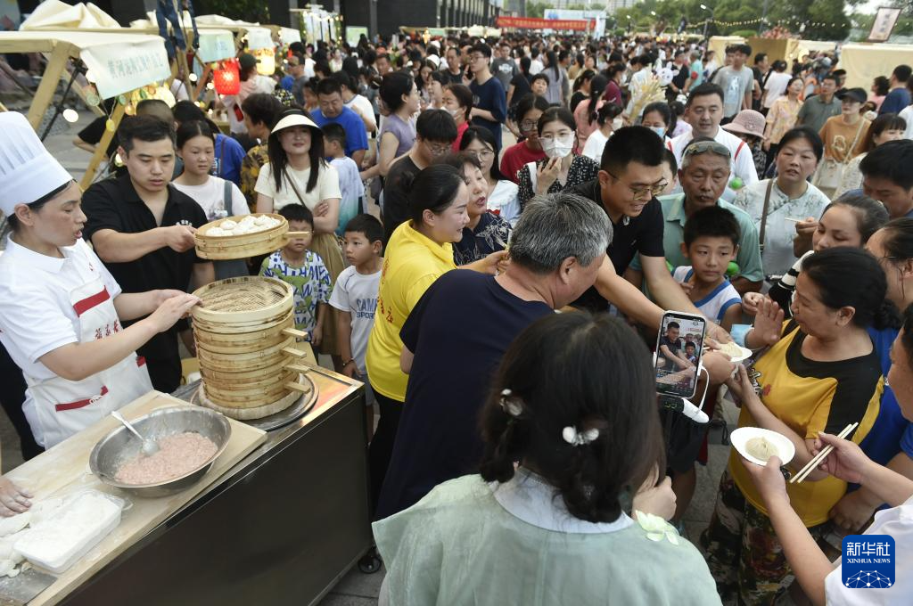 7月14日傍晚,游人在开封市开元广场设立的“非遗市集”现场品尝开封灌汤包。