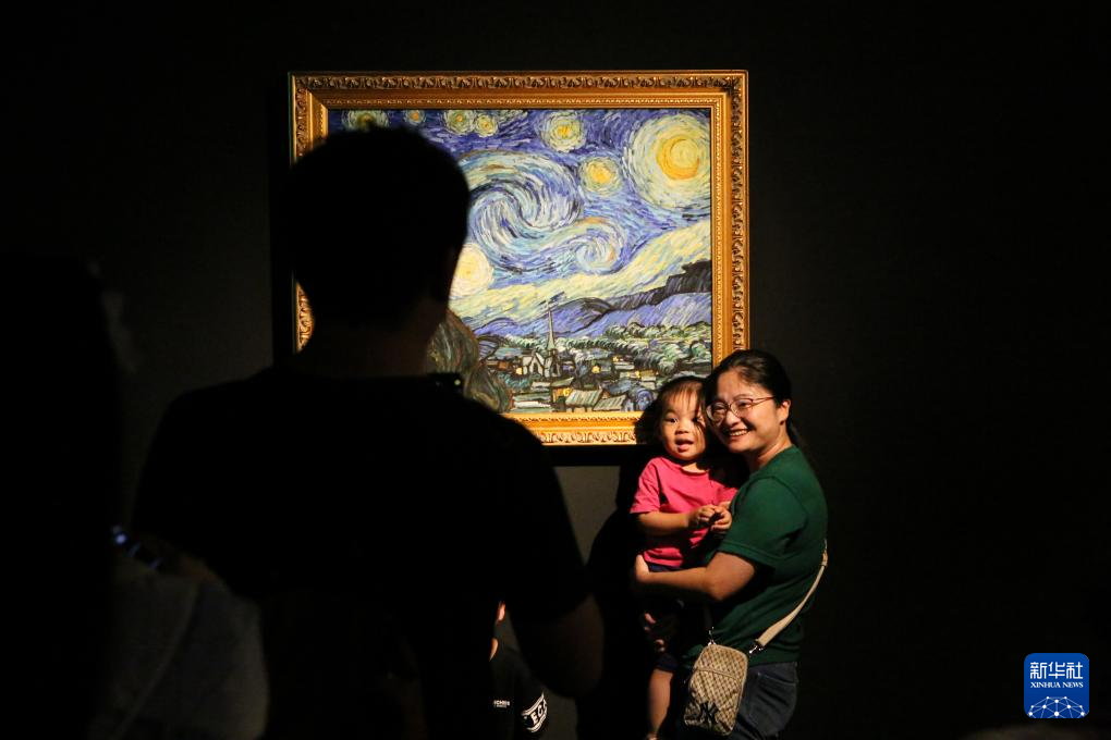 7月16日晚,参观者在“梵高再现”光影展上拍照留念。