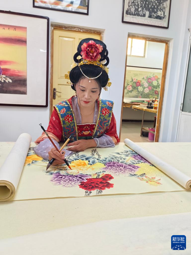 7月24日,画师在山东省巨野县永丰街道办事处洪庙村乡村画院绘制工笔画作品。
