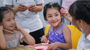三名乌兹别克斯坦舞蹈演员在新疆国际大巴扎景区与一名小游客(前左二)合影(7月25日摄)。