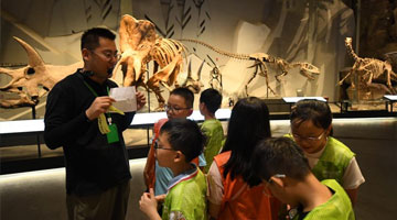 一名工作人员(前右二)在新疆图书馆向前来参观的国外舞蹈团展示、讲解《永乐大典》的篇章(7月23日摄)。