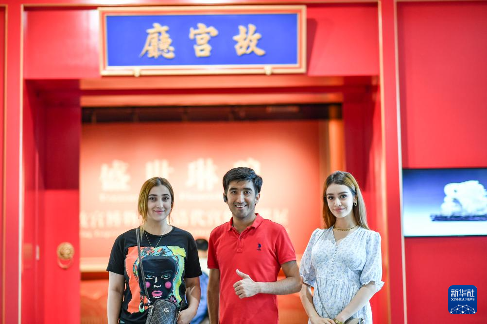 三名塔吉克斯坦舞蹈演员在新疆博物馆“故宫厅”前合影(7月29日摄)。