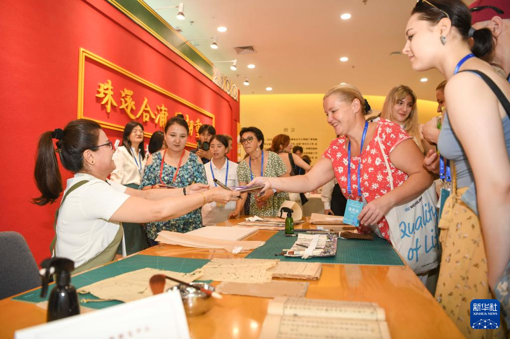 新疆古籍修复师米娜瓦尔·阿不都热合曼(左一)向俄罗斯萨拉托夫州曙光歌舞团演员赠送桑皮纸(7月23日摄)。