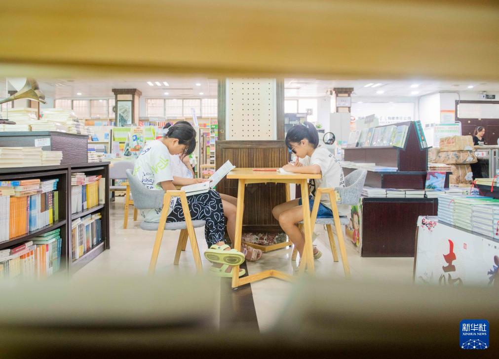 8月1日,几名学生在湖南省永州市道县新华书店阅读。