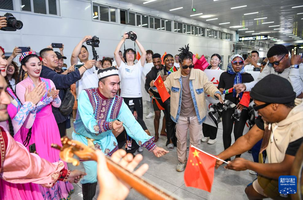音乐声响,曼舞飞扬。在出口大厅,还没来得及放下背包,这些来自南非埃尔维斯舞蹈艺术团的成员就学起新疆舞,随后展示了南非祖鲁舞,旅途疲劳一扫而空。