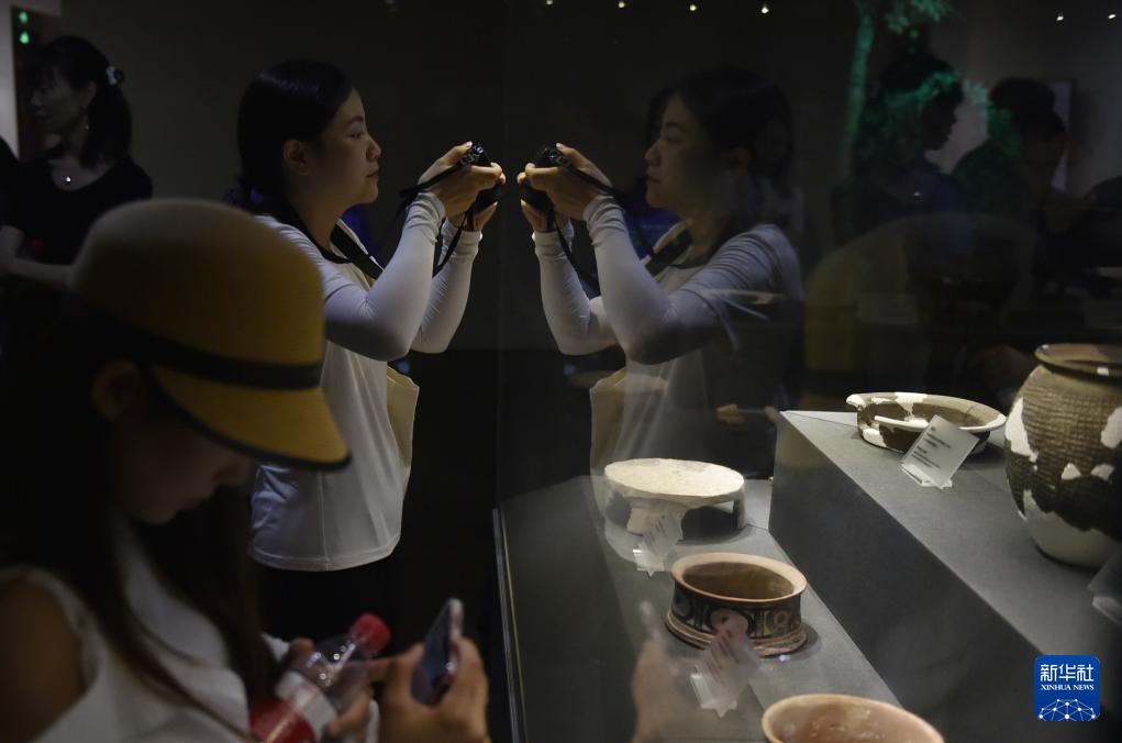 8月8日,参加集中采访的媒体记者在位于河南省郑州市的大河村遗址博物馆参观拍照。