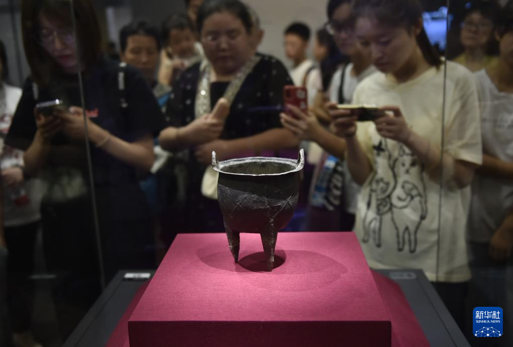 8月12日,观众在位于河南省洛阳市偃师区的二里头夏都遗址博物馆参观网格纹铜鼎。