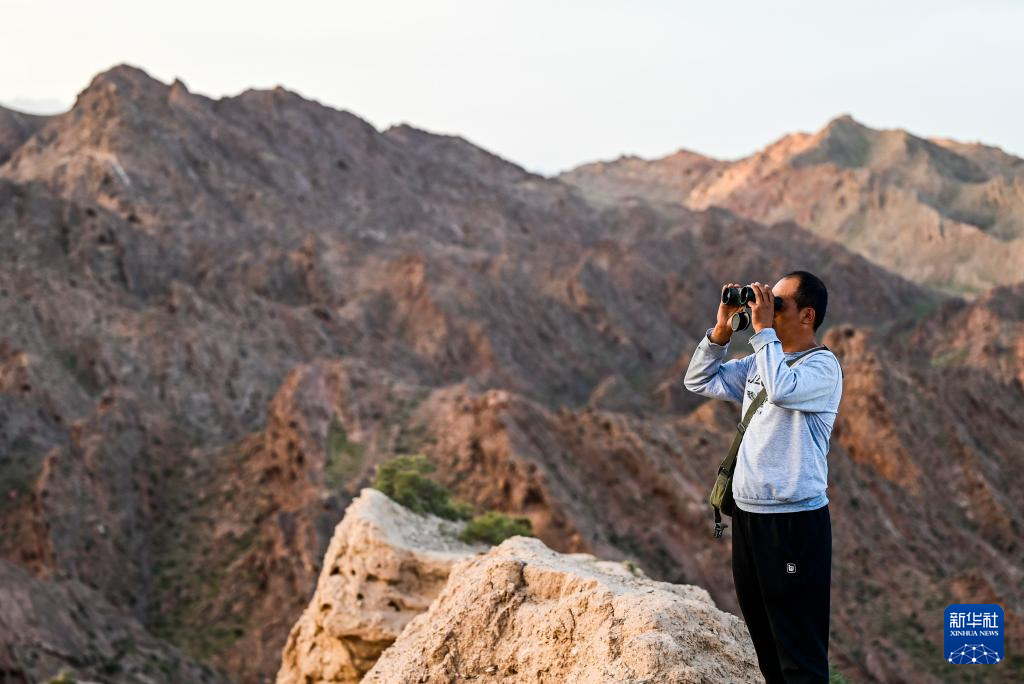 8月20日,董海宁骑摩托车巡查贺兰山沿线的明长城永宁段,利用望远镜观察远处长城情况。