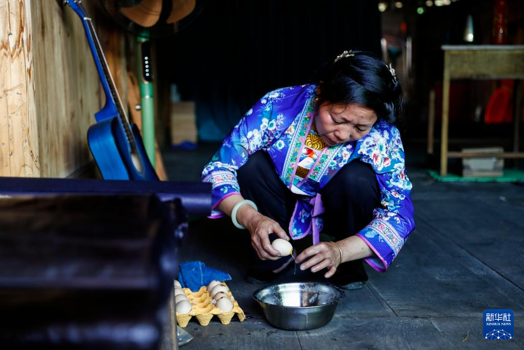 乌英苗寨妇女梁足英在取鸡蛋清,准备给布料涂抹(2023年8月30日摄)。