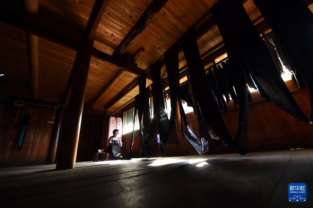 乌英苗寨妇女梁足英在晾晒还未完工的亮布(2023年8月30日摄)。