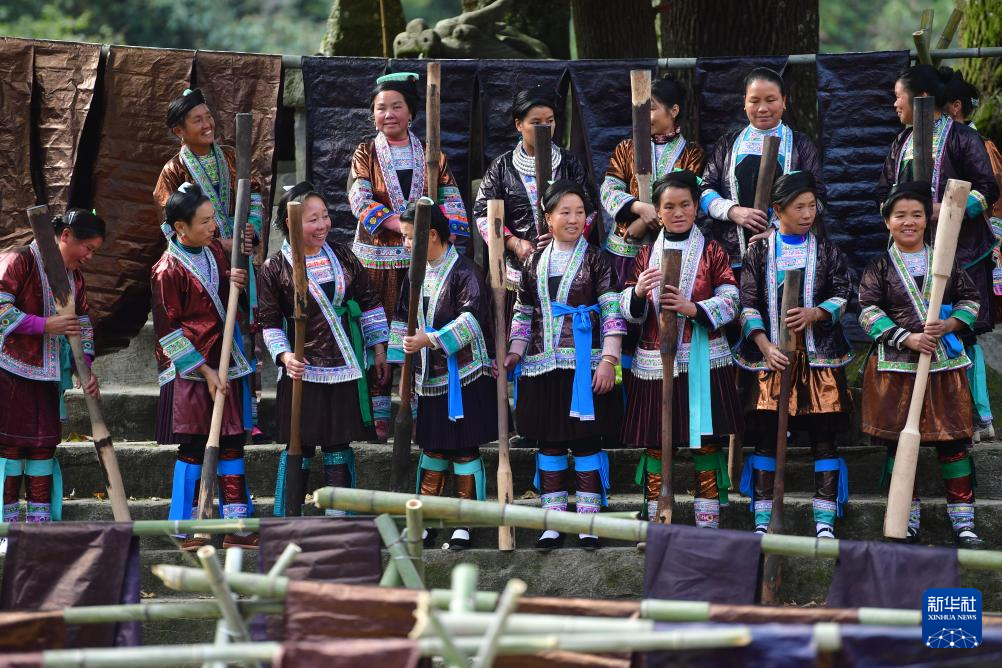 乌英苗寨妇女韦妹丽(右)在用传统亮布槌捶打布料(2020年9月2日摄)。